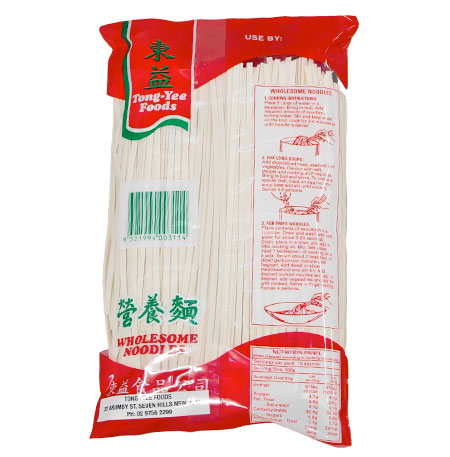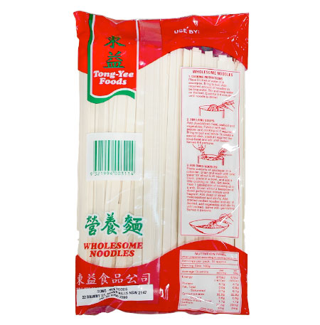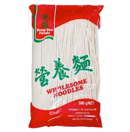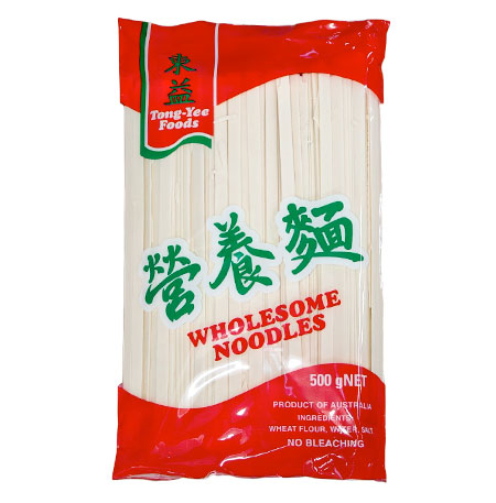 Our Wholesome Noodle (flat size) is a 500 grams dry noodle similar to our Yang Chuen Noodle, where it can be kept in a cool place outside of the refrigerator. This product is flat and thick in length and is best served in noodle soup.